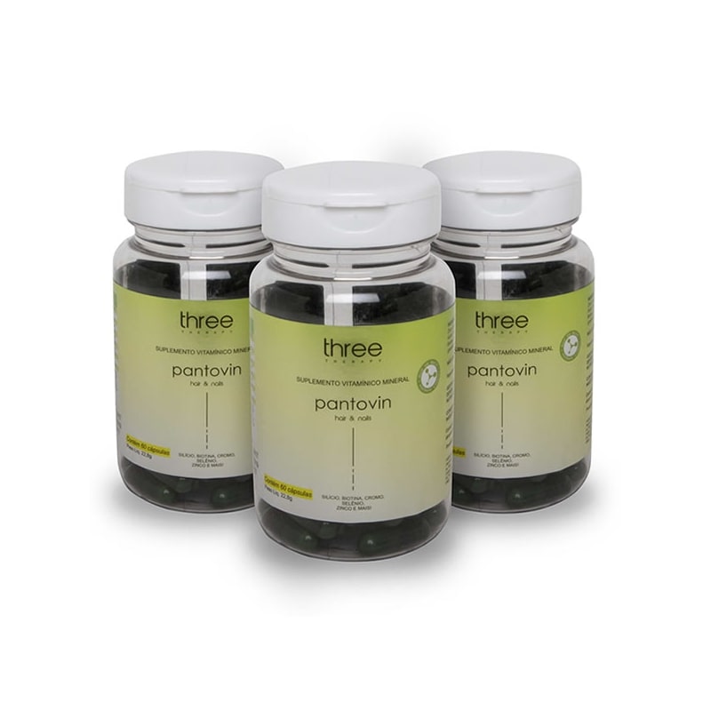 As Cápsulas de Pantovin da Three Therapy é um complexo formulado com vitaminas essenciais para tratar os cabelos de dentro para fora, fortalecendo as unhas e ajudando a ter uma pele mais firme. Sua fórmula revolucionária contém ativos como o Silício, Viitaminas A, B6 e C, Ácido Fólico, Biotina (vitamina H), Selênio, Cromo e Zinco.